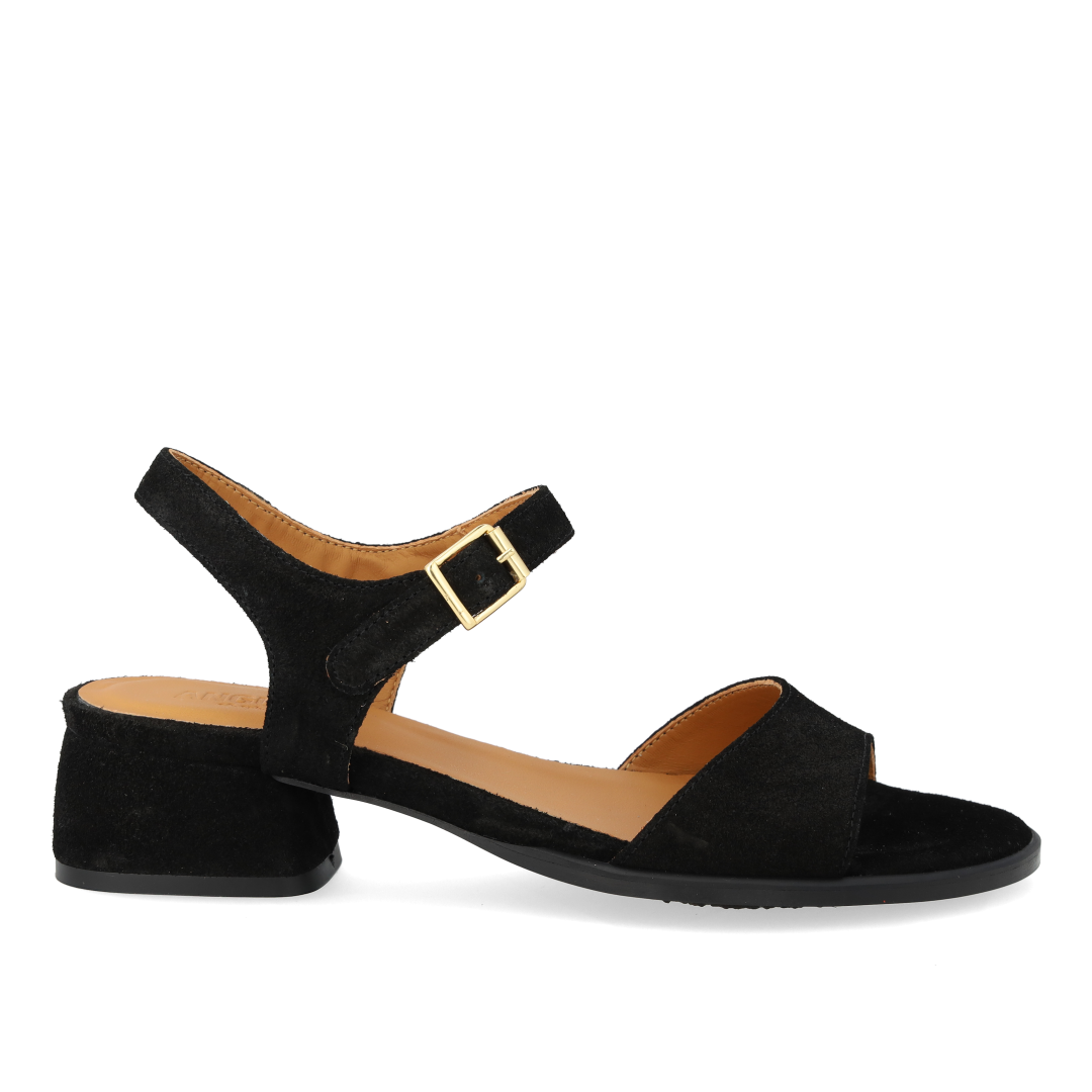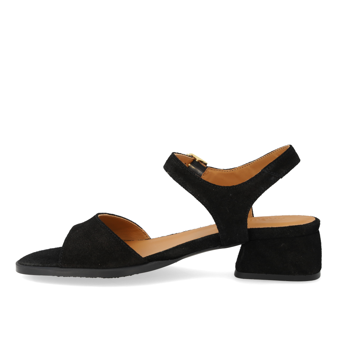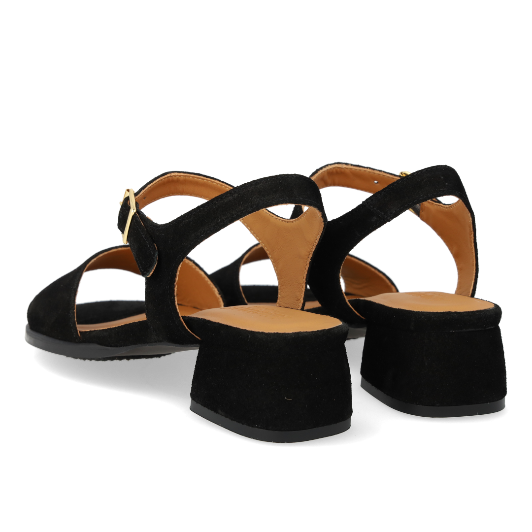 Hohe Sandale aus schwarzem Wildleder mit einem 3,5 cm hohen, geschwungenen Blockabsatz. Die Sandale hat eine runde Spitze, einen Knöchelriemen mit verstellbarem Verschluss mit goldener Schnalle, eine gepolsterte Innensohle, chromfreies Lederfutter und eine leichte und flexible schwarze Tunika-Sohle mit weichem Rohgummi an der Laufsohle für zusätzlichen Komfort und Stabilität. Gefertigt aus natürlichem und atmungsaktivem Leder. Entworfen in Dänemark und mit Liebe handgefertigt in Portugal.