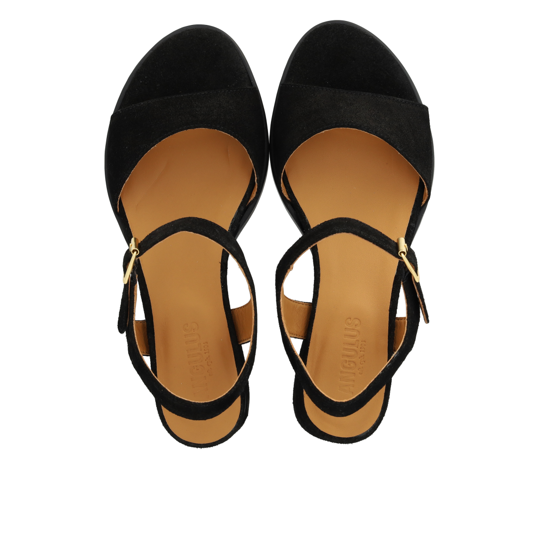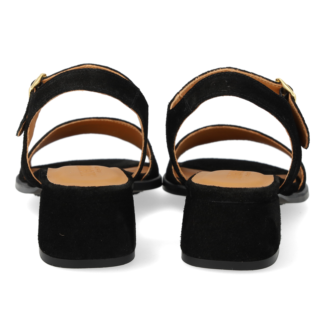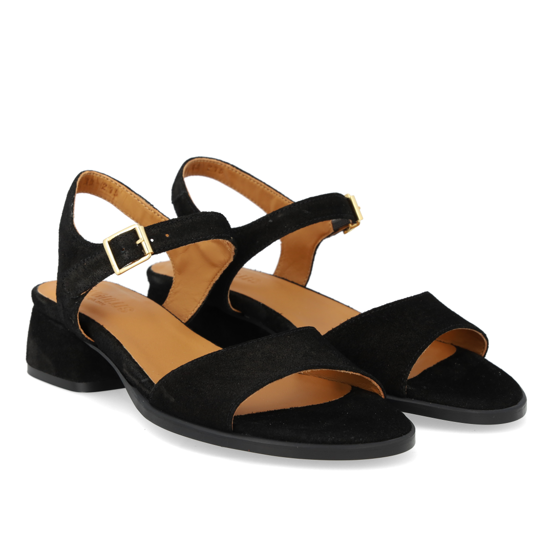 Hohe Sandale aus schwarzem Wildleder mit einem 3,5 cm hohen, geschwungenen Blockabsatz. Die Sandale hat eine runde Spitze, einen Knöchelriemen mit verstellbarem Verschluss mit goldener Schnalle, eine gepolsterte Innensohle, chromfreies Lederfutter und eine leichte und flexible schwarze Tunika-Sohle mit weichem Rohgummi an der Laufsohle für zusätzlichen Komfort und Stabilität. Gefertigt aus natürlichem und atmungsaktivem Leder. Entworfen in Dänemark und mit Liebe handgefertigt in Portugal.