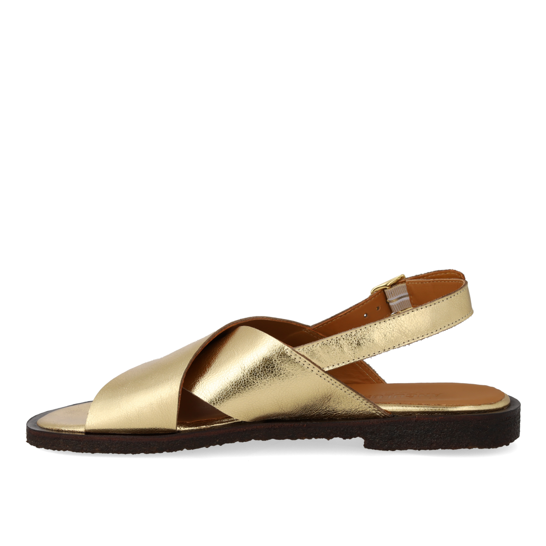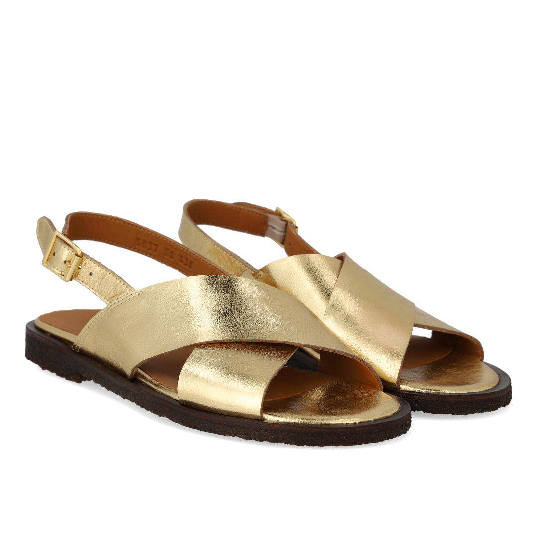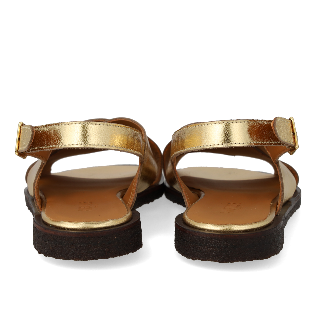 Klassische Cross-Sandale aus Leder. Die Sandale hat eine runde Spitze, einen verstellbaren Knöchelriemen mit Gummizug und Schnallenverschluss, eine gepolsterte Lederinnensohle und eine leichte, weiche und flexible dunkelbraune Rohgummisohle aus erneuerbarem Naturkautschuk. Gefertigt aus natürlichem und atmungsaktivem Leder. Entworfen in Dänemark und handgefertigt mit Liebe in Portugal.