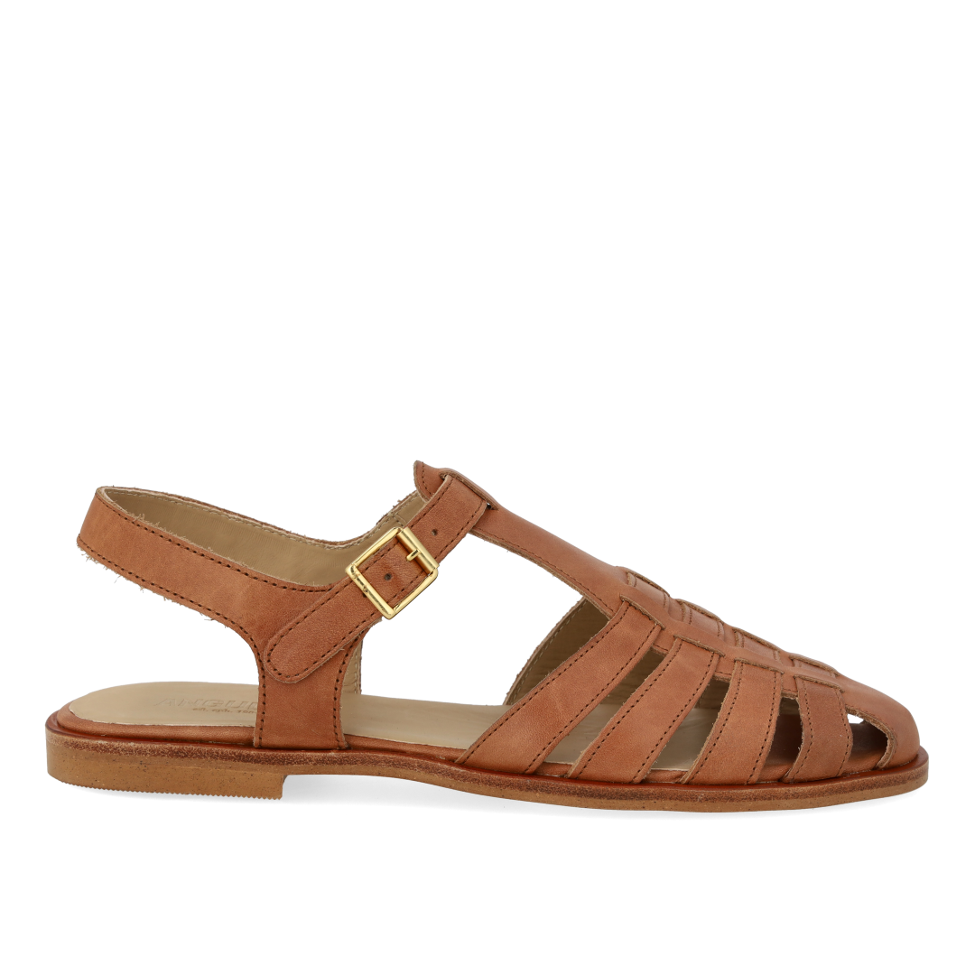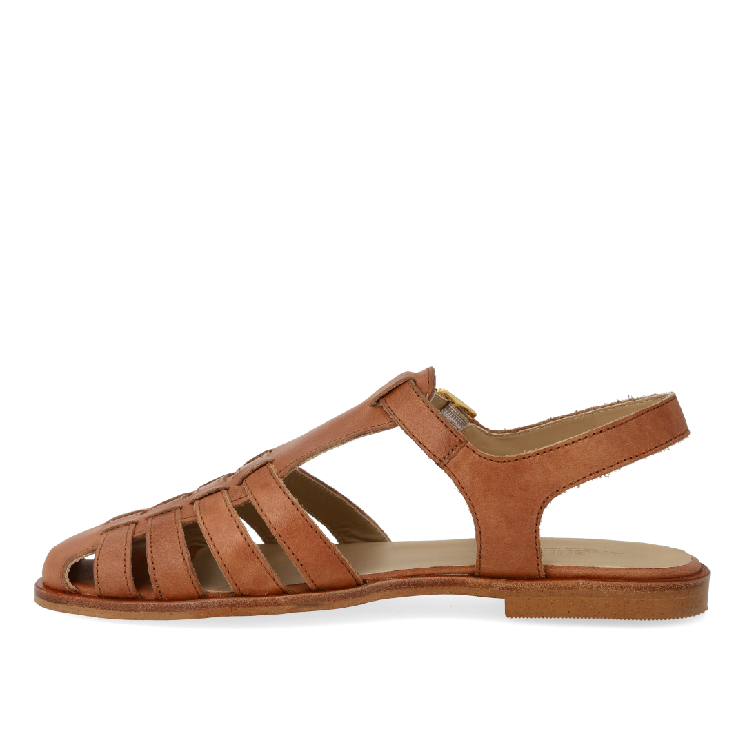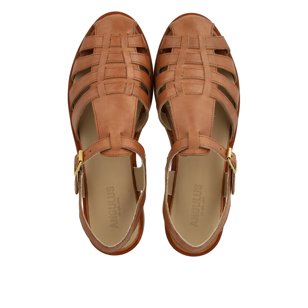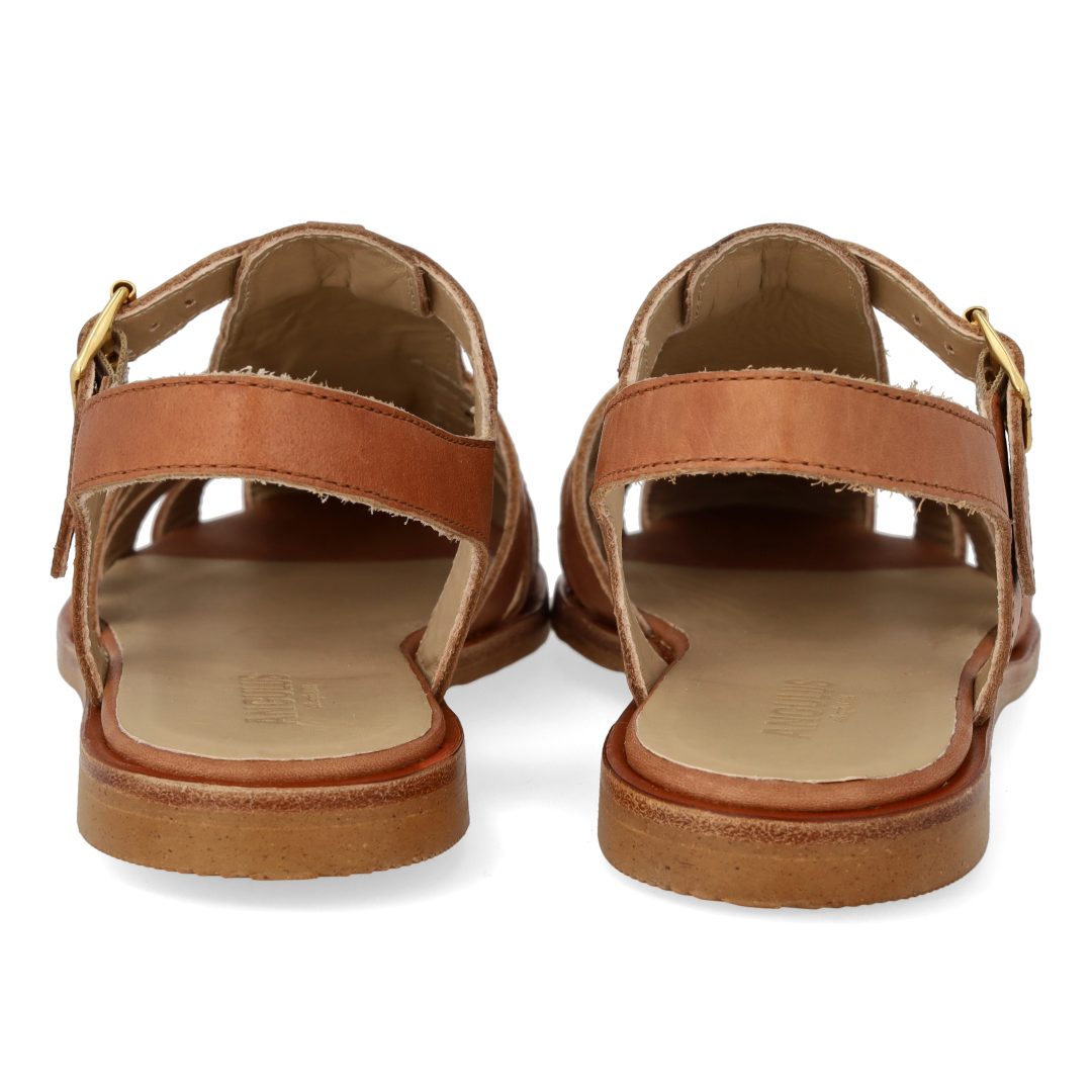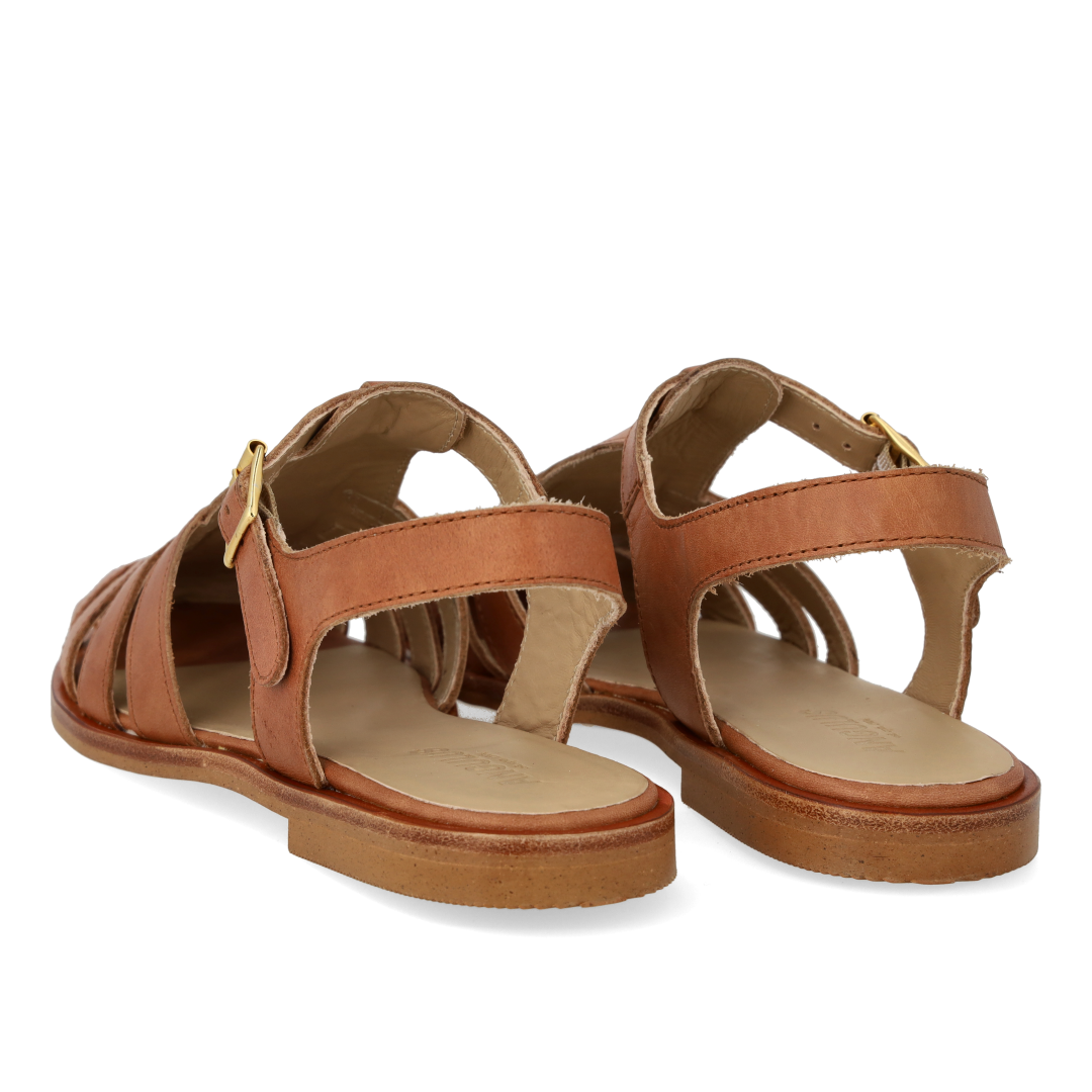 Klassische Fisherman's Sandale aus Leder mit einer Tunit-Sohle. Die Sandale hat eine abgerundete Spitze, einen offenen Absatz, einen verstellbaren Verschluss mit goldener Schnalle, eine gepolsterte Innensohle aus Leder und eine leichte Tunitsohle. Gefertigt aus natürlichem und atmungsaktivem Leder. Entworfen in Dänemark und handgefertigt mit Liebe in Portugal.