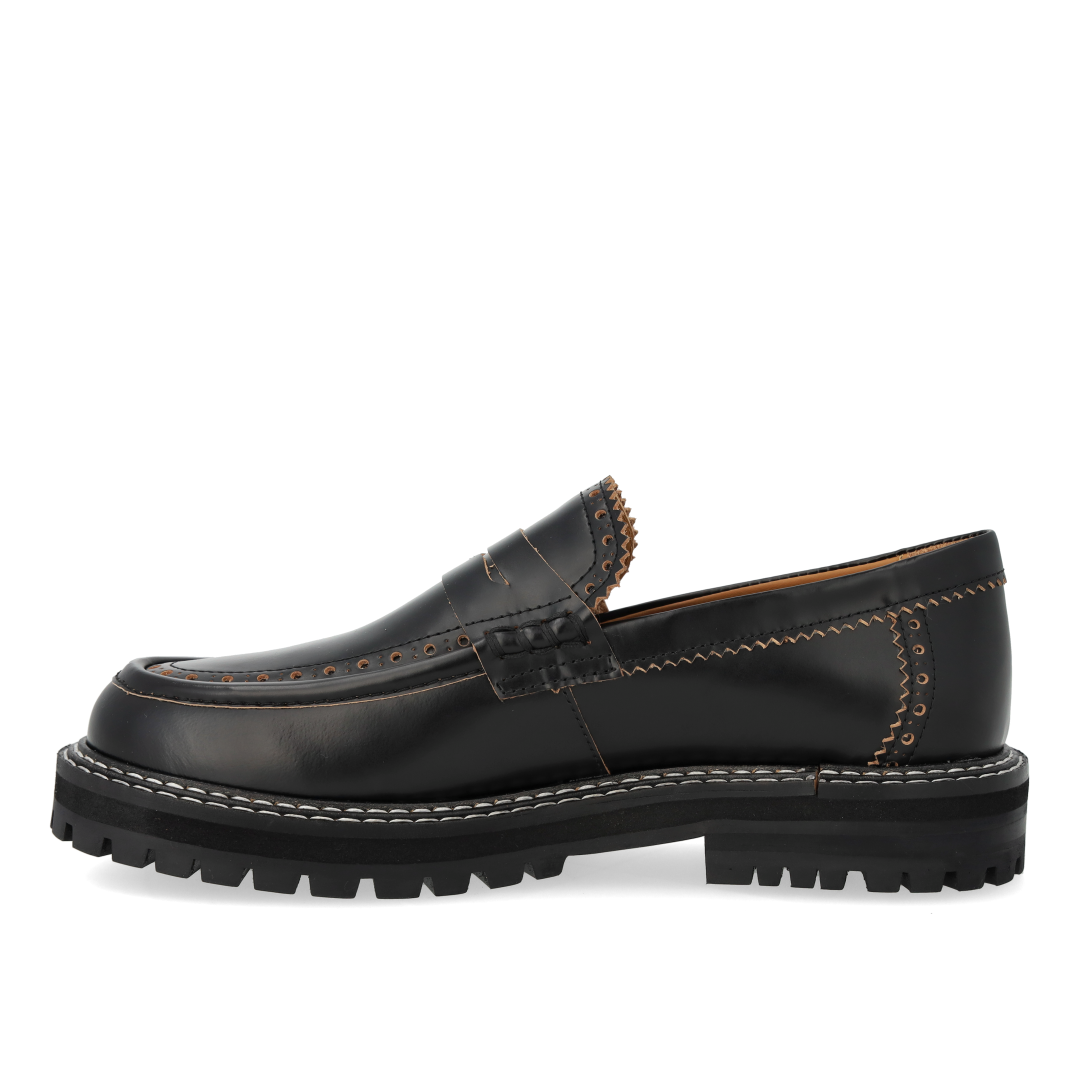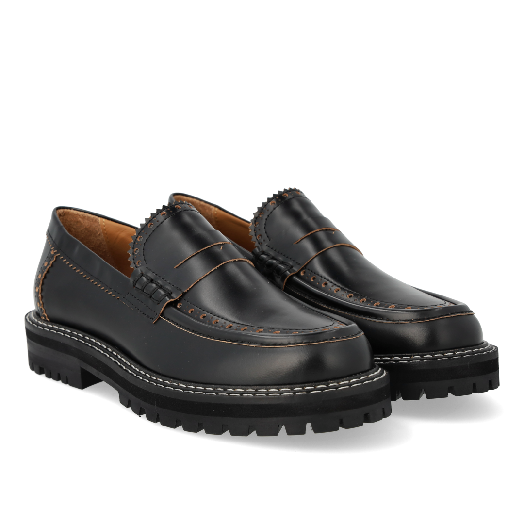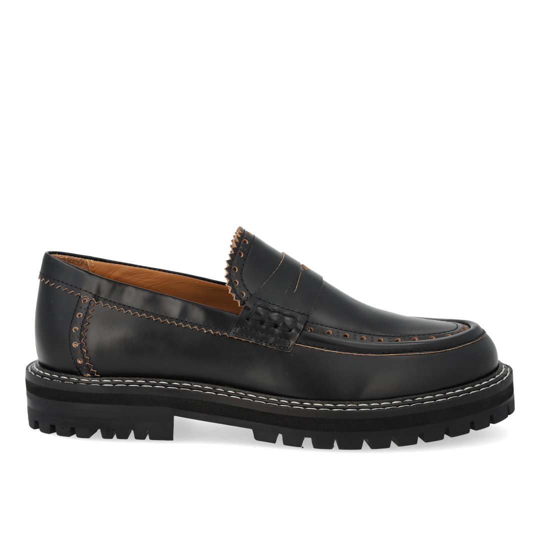 Chunky Penny Loafer mit dekorativem Brogue-Lochmuster und Kontrastnähten. Der Loafer hat eine abgerundete Spitze, eine gepolsterte Innensohle, chromfreies Lederfutter und eine schwarze Traktionssohle aus Gummi. Gefertigt aus natürlichem und atmungsaktivem Leder. Entworfen in Dänemark und handgefertigt mit Liebe in Portugal.