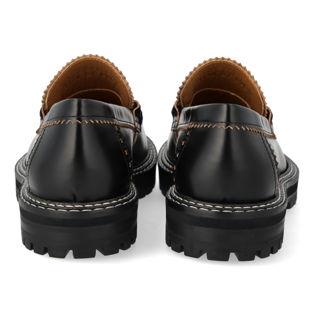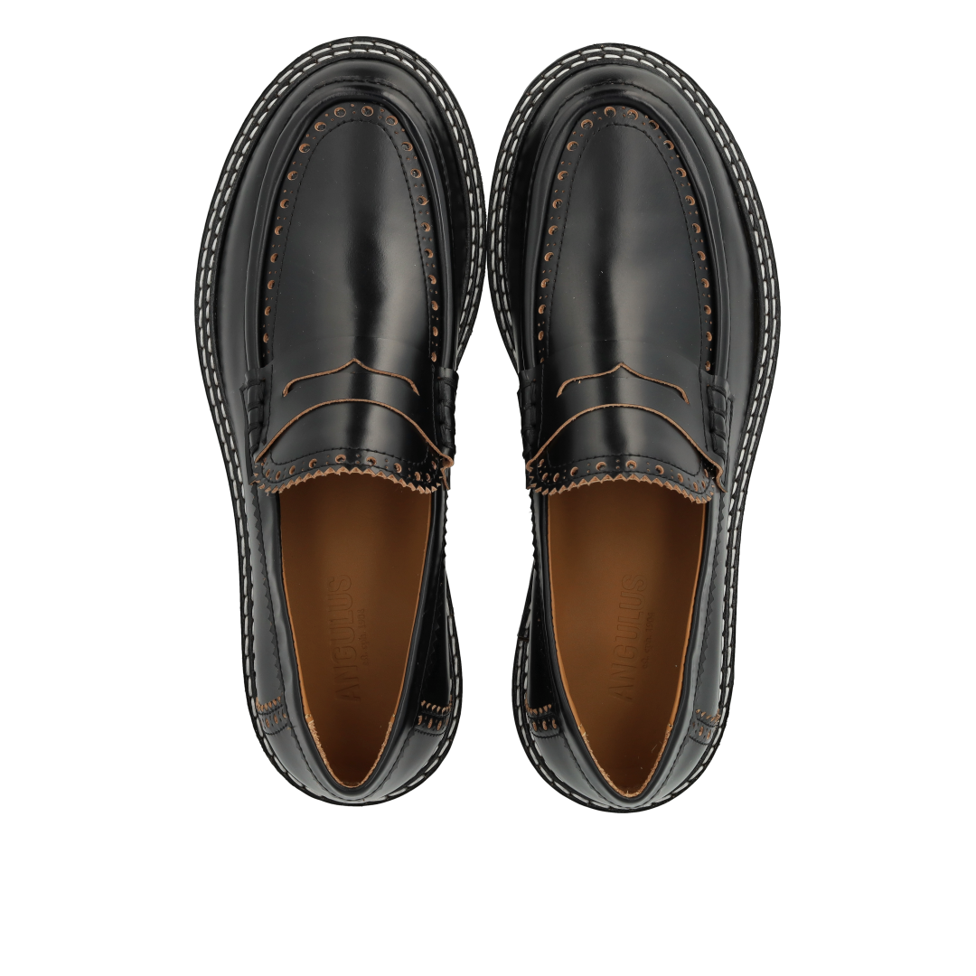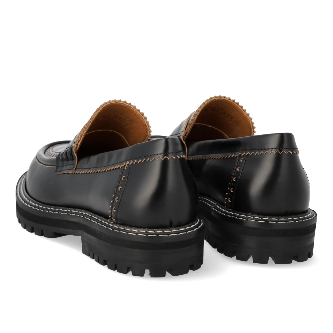 Chunky Penny Loafer mit dekorativem Brogue-Lochmuster und Kontrastnähten. Der Loafer hat eine abgerundete Spitze, eine gepolsterte Innensohle, chromfreies Lederfutter und eine schwarze Traktionssohle aus Gummi. Gefertigt aus natürlichem und atmungsaktivem Leder. Entworfen in Dänemark und handgefertigt mit Liebe in Portugal.