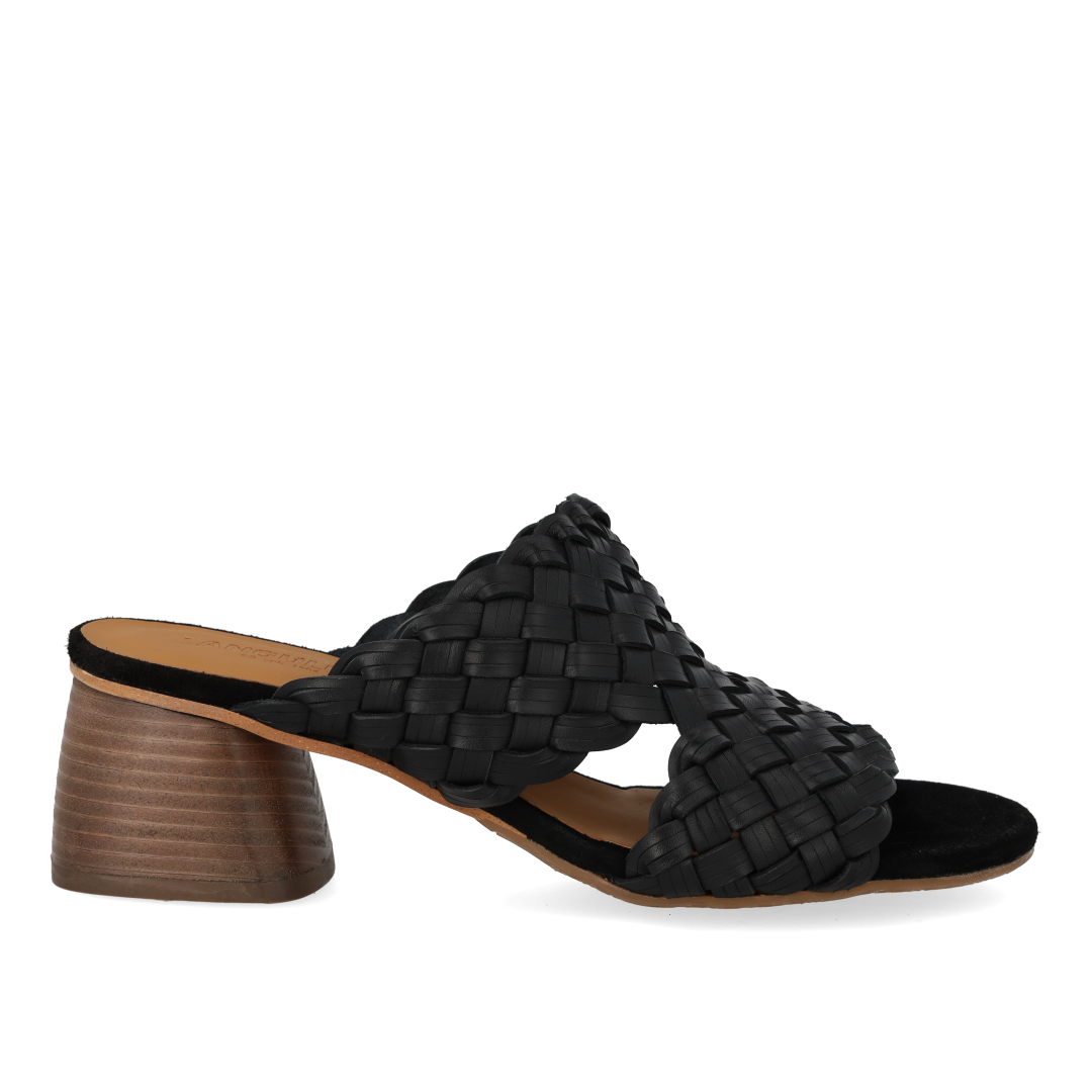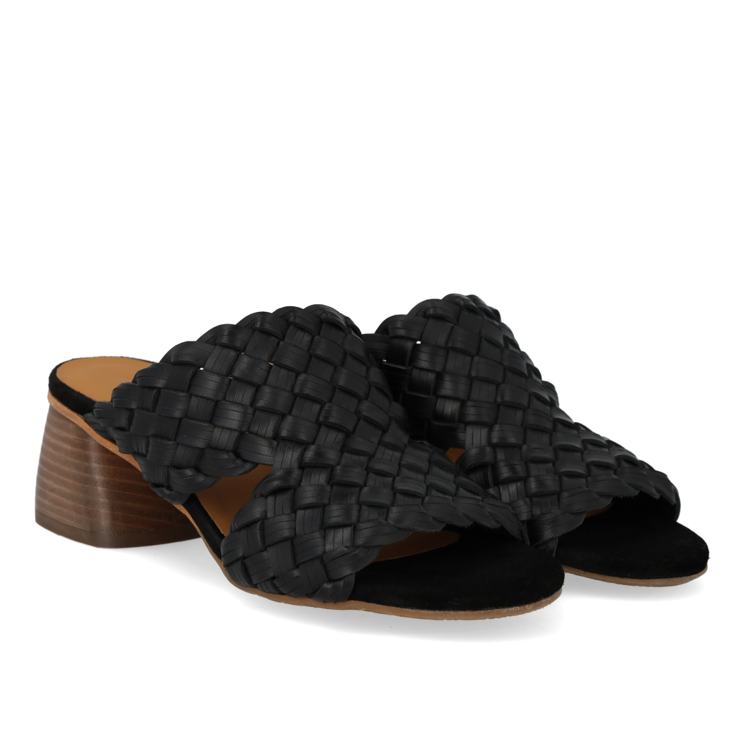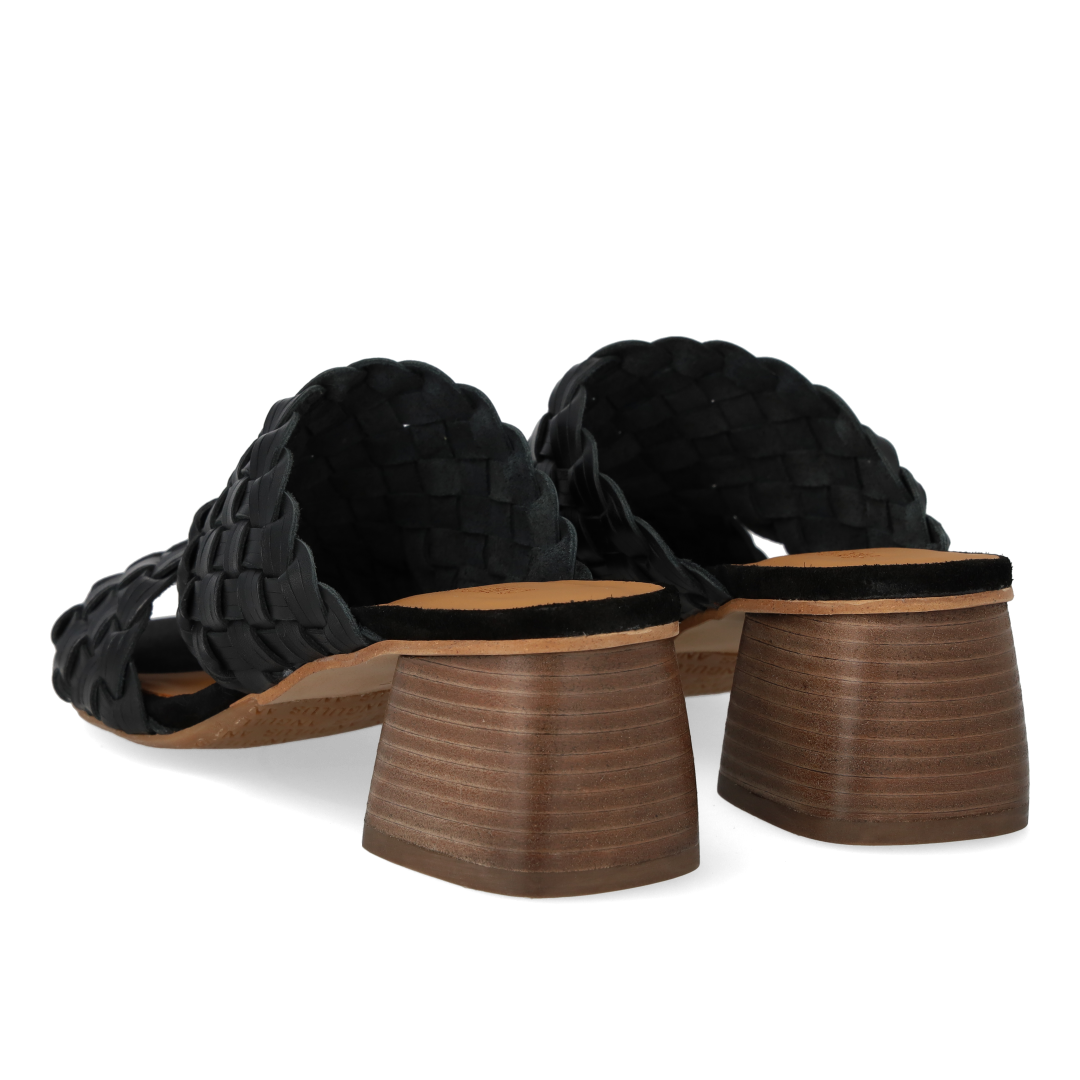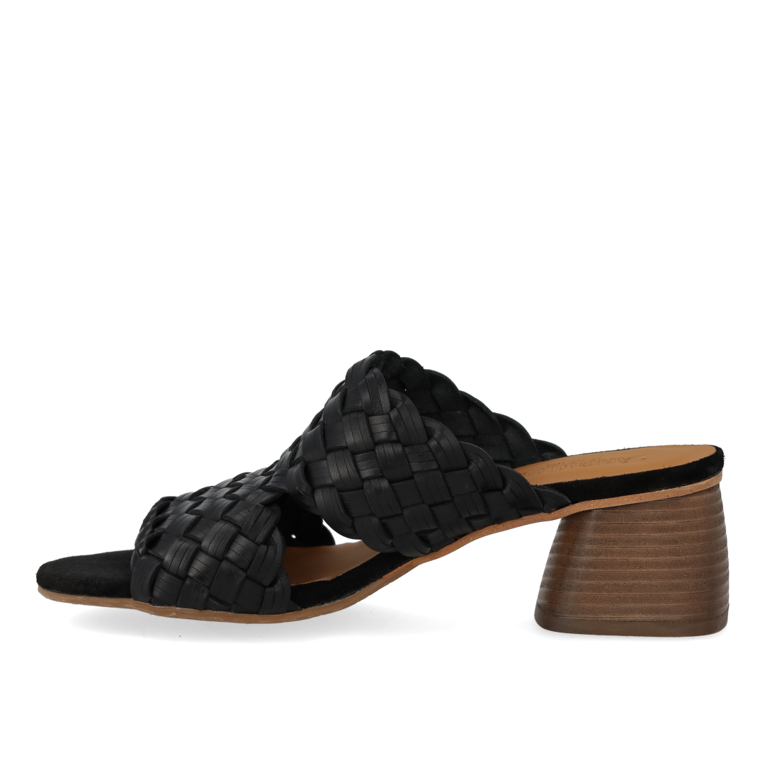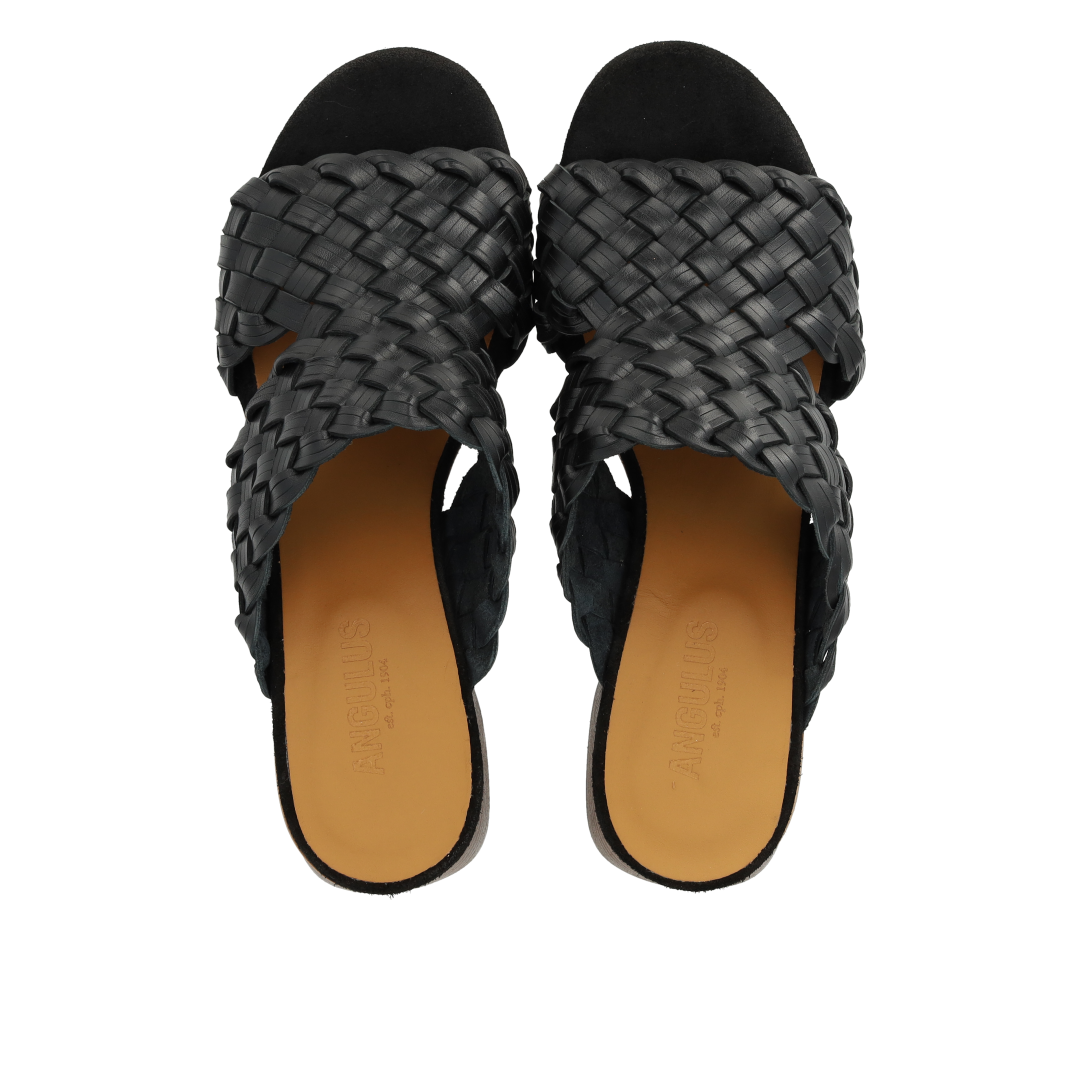 Minimalistische Pantolette mit geflochtenem Lederdetail. Die Sandale hat eine runde Zehenkappe, eine gepolsterte Innensohle aus chromfreiem Leder und eine leichte ANGULUS-Logo-Gummisohle mit einem 5 cm hohen, skulpturalen Holzabsatz. Aus natürlichem und atmungsaktivem Leder gefertigt. Entworfen in Dänemark und mit Liebe in Portugal handgefertigt. Kann Chrom enthalten.