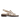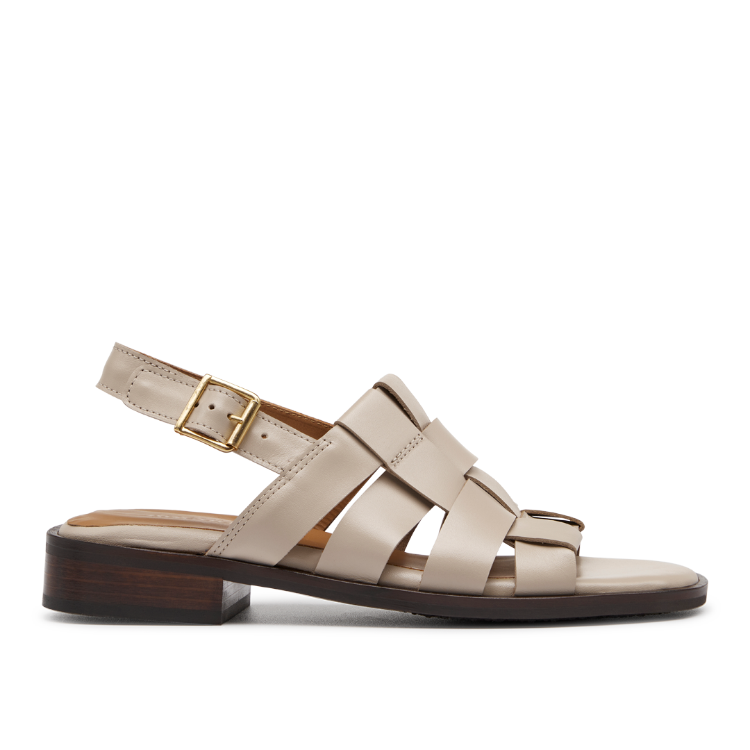 Die Sandale hat eine moderate quadratische Spitze, einen verstellbaren Knöchelriemen mit goldener Schnalle und Gummizug, eine gepolsterte Lederinnensohle und eine leichte Tunitsohle mit einem 2,5 cm kleinen Absatz.