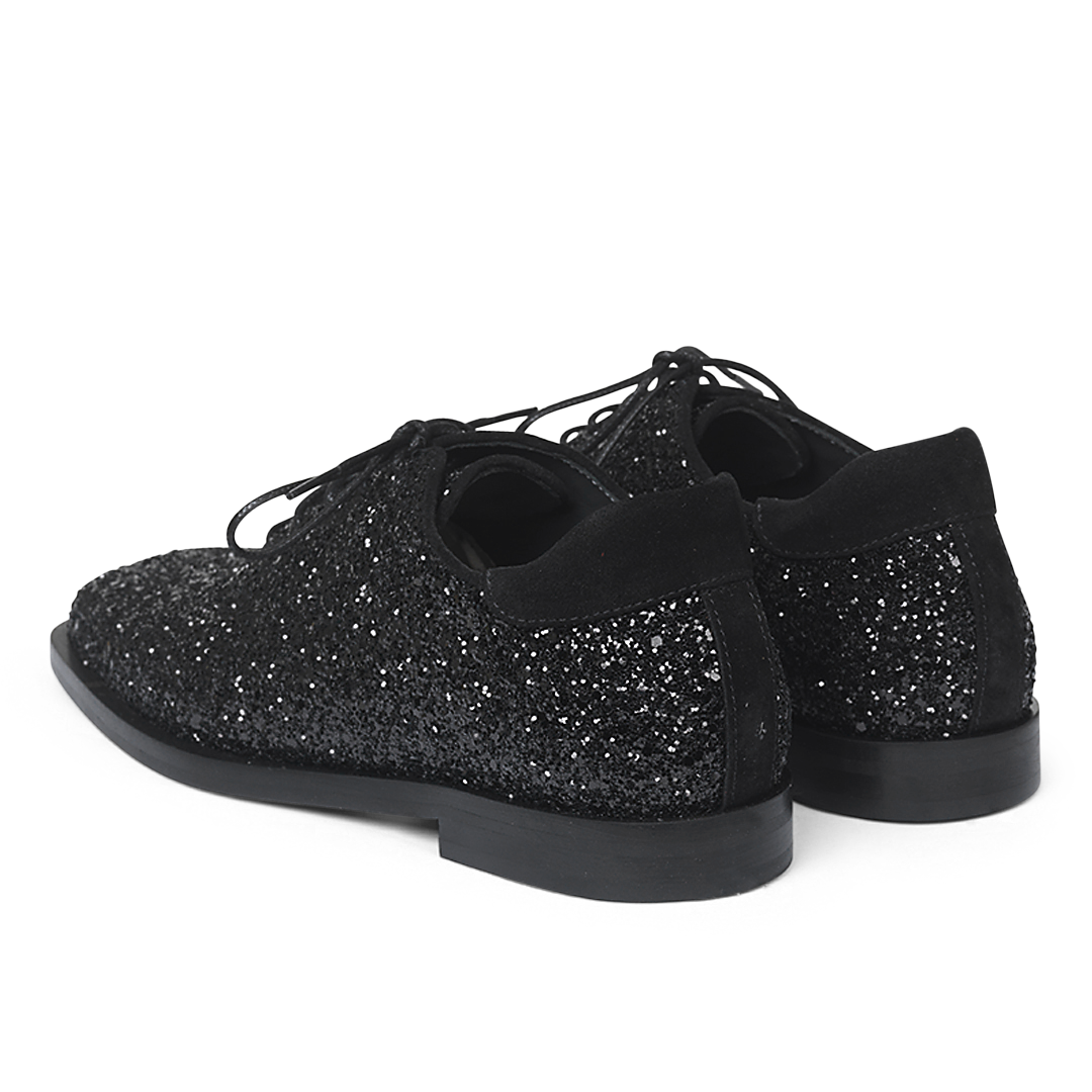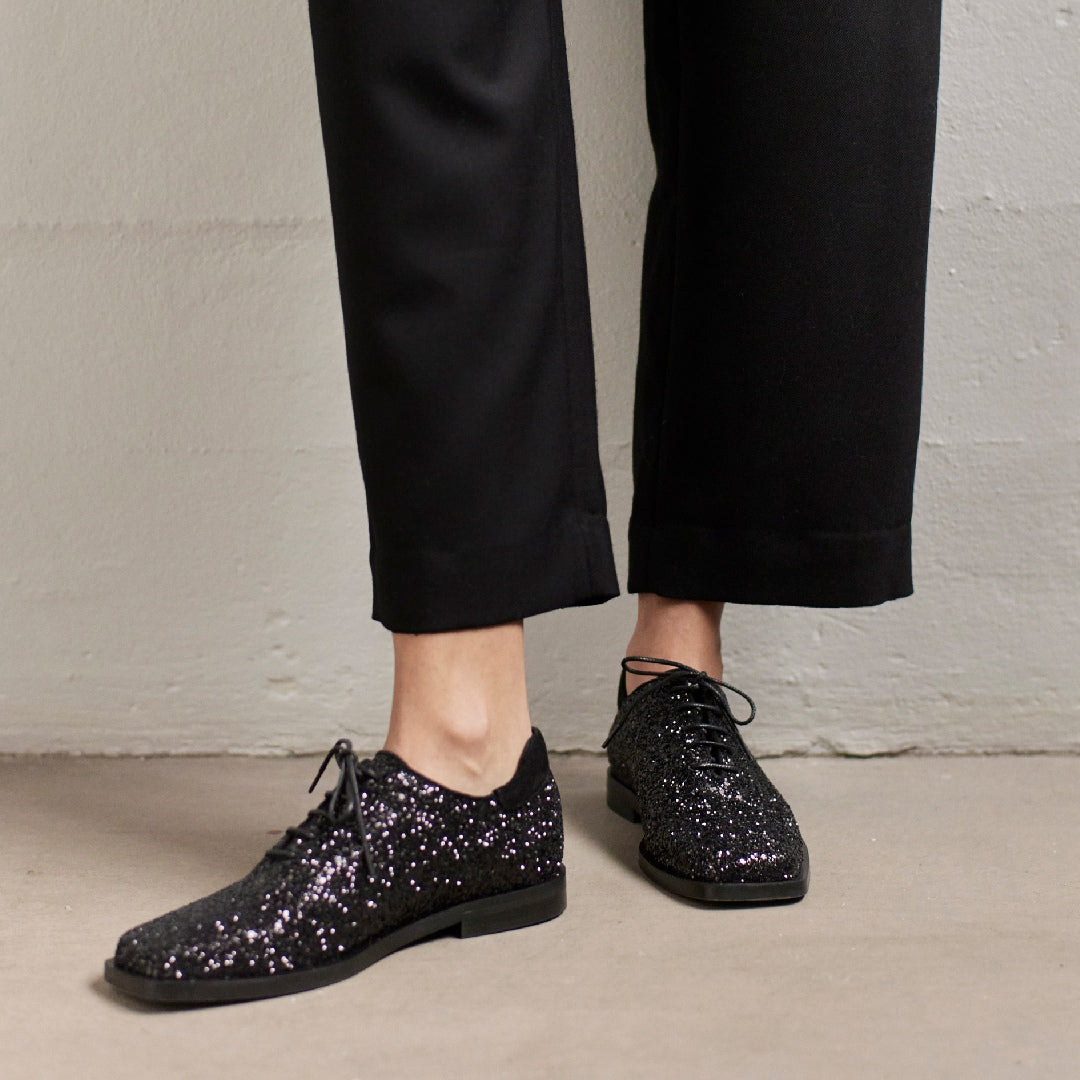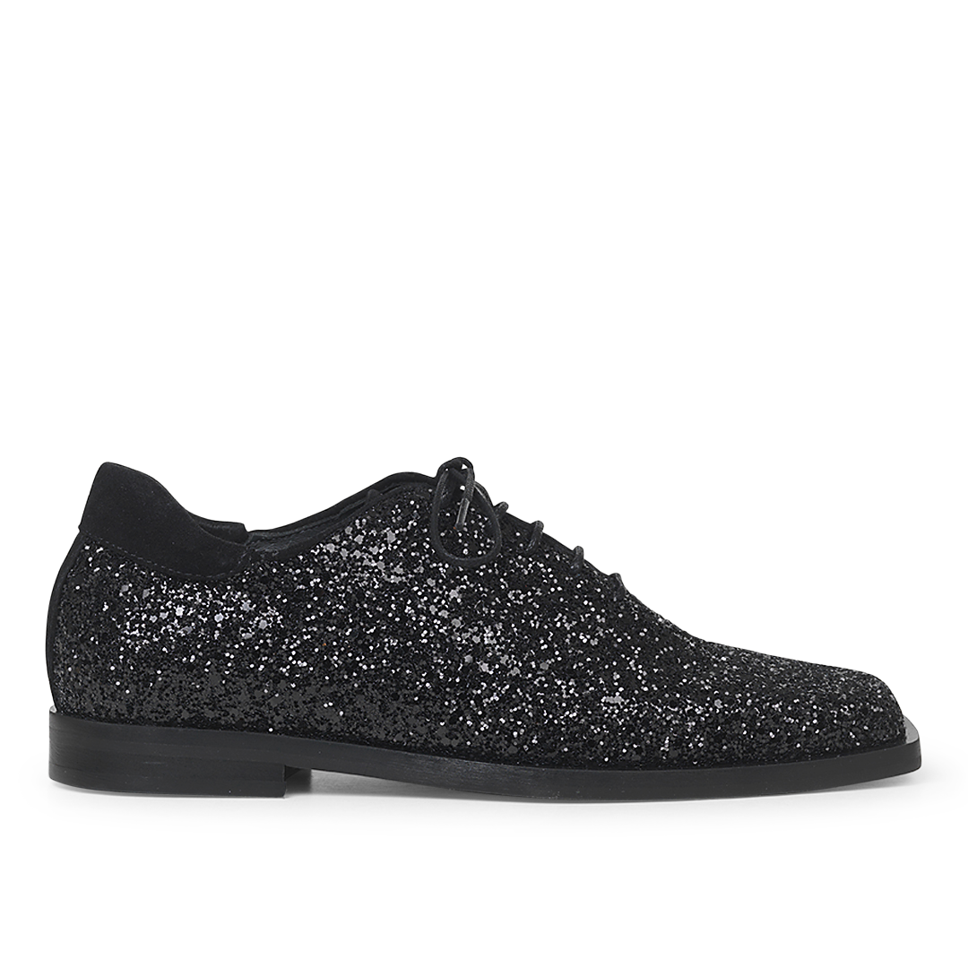 Glitzernder Schnürschuh mit quadratischer Zehe.