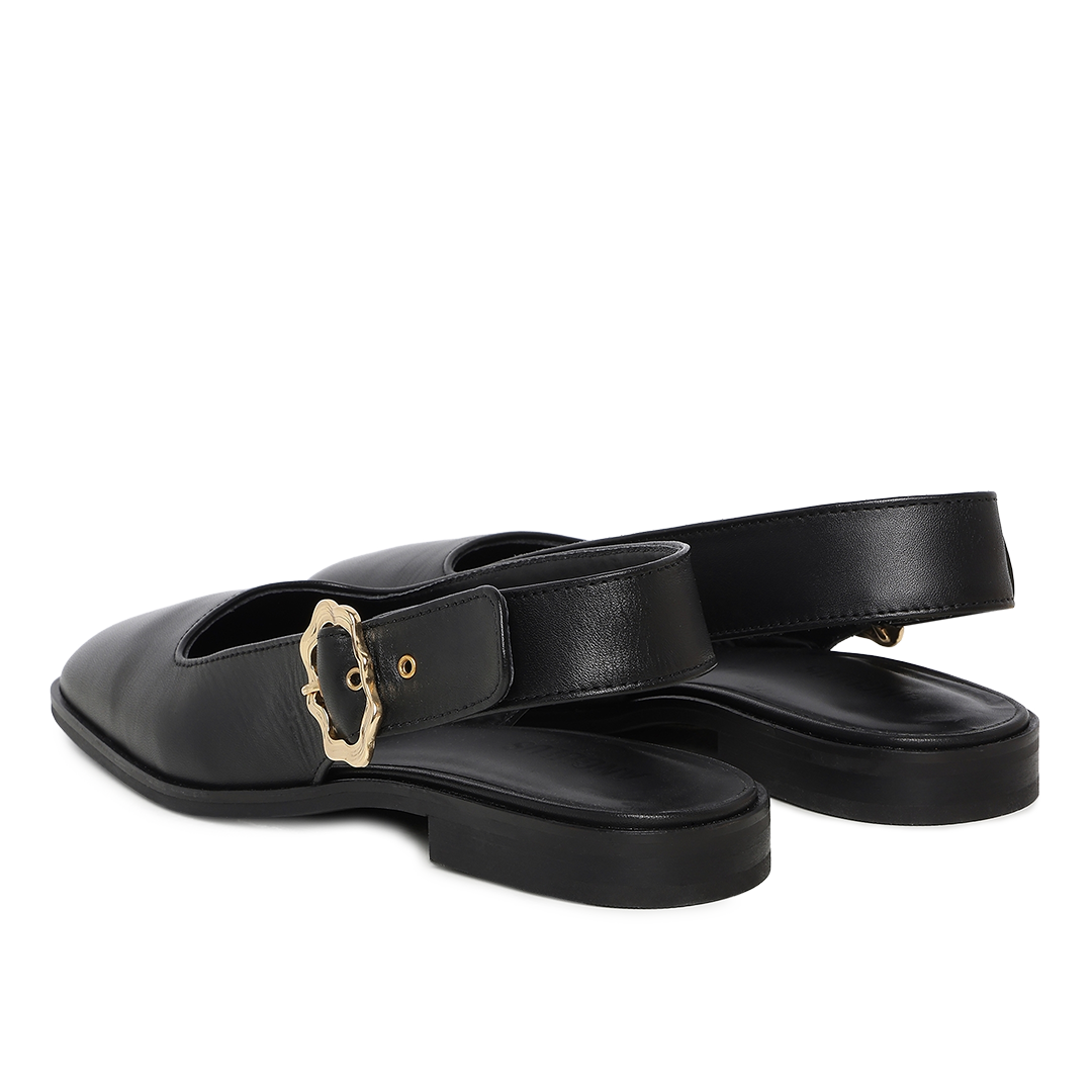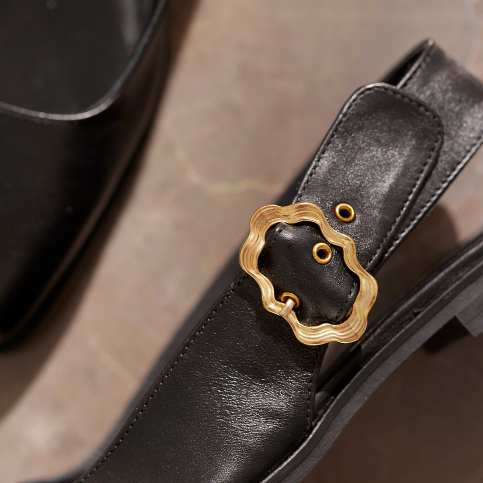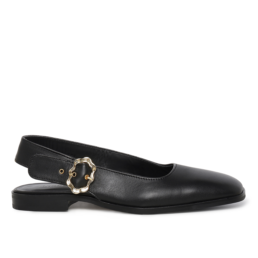 Ballerina mit quadratischer Spitze, Slingback und goldfarbener, gewellter Schnalle. Der Ballerina hat einen offenen Absatz, einen verstellbaren Knöchelriemen mit goldfarbener Wellenschnalle, eine gepolsterte Innensohle und eine leichte Tunitsohle. Gefertigt aus natürlichem und atmungsaktivem Leder. Entworfen in Dänemark und mit Liebe handgefertigt in Portugal.