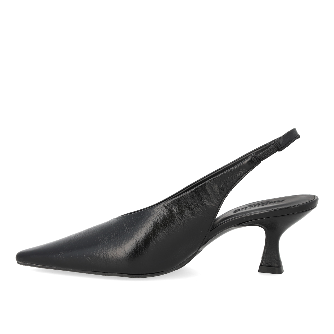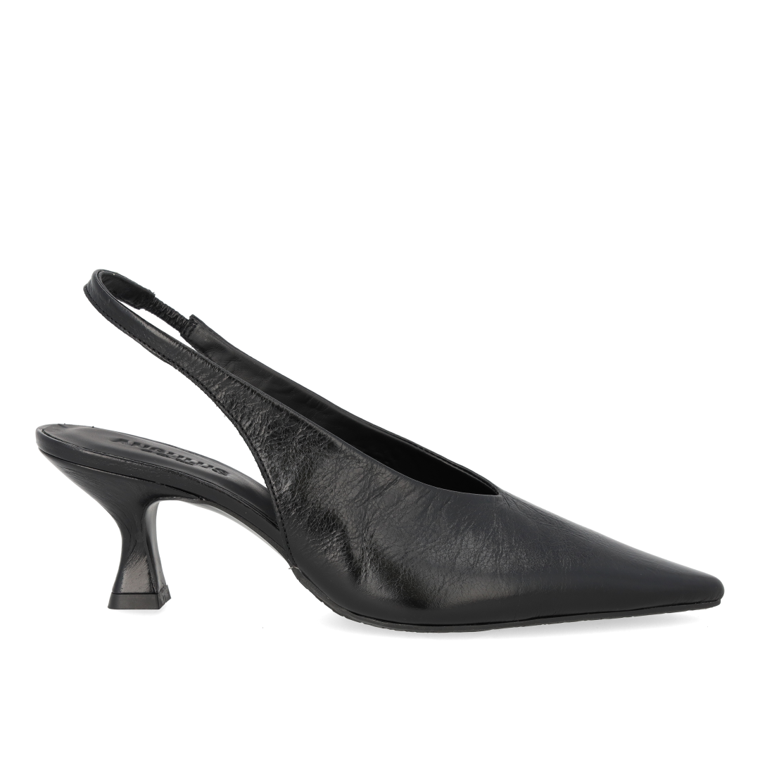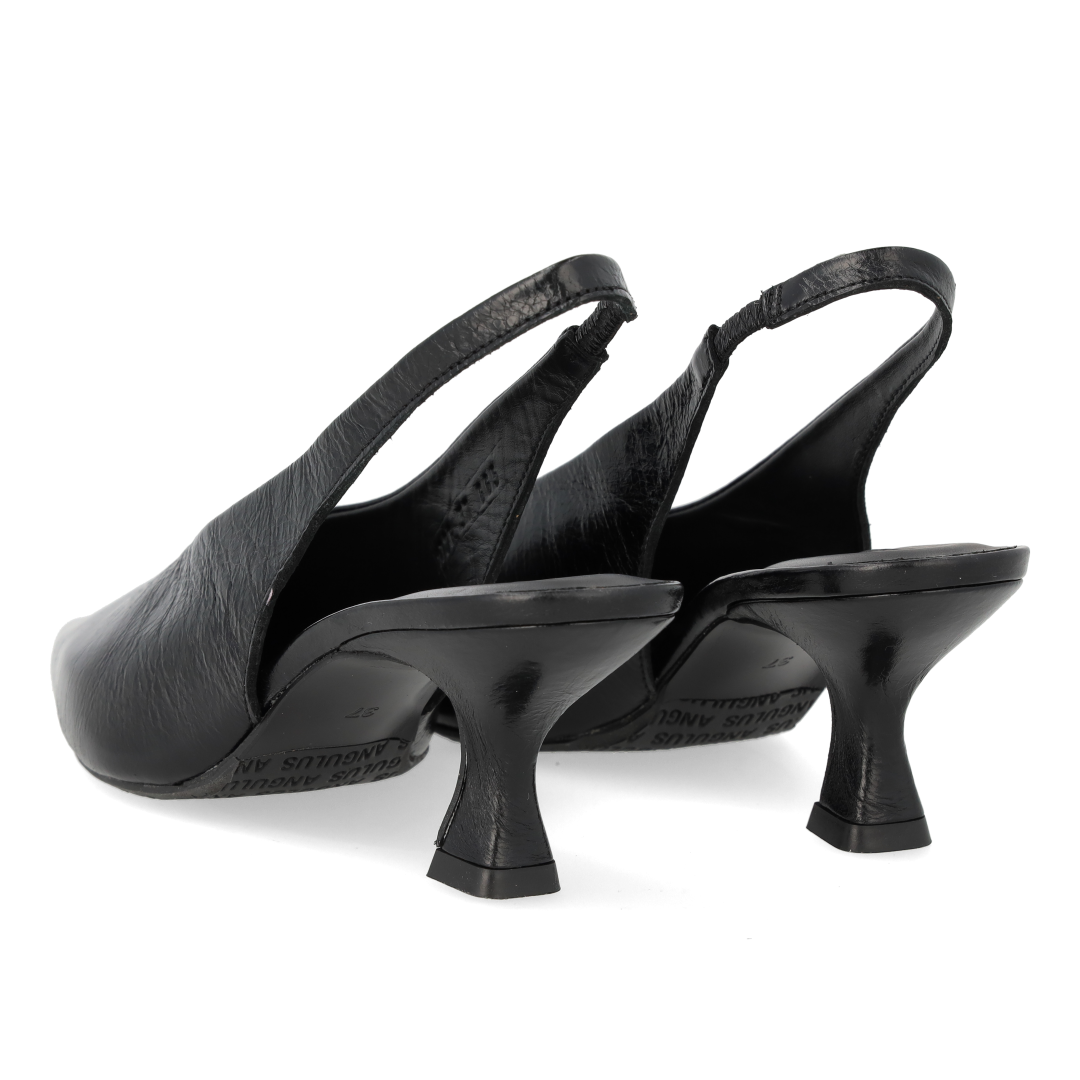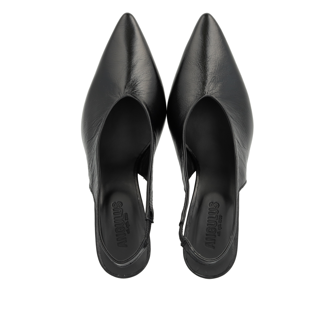 Minimalistische Slingback-Sandale aus Leder mit spitzer Zehenpartie. Die Sandale hat eine gepolsterte Innensohle und ein Futter aus chromfreiem Leder, einen Slingback-Fesselriemen mit Gummizug und eine schwarze ANGULUS-Logo-Gummisohle mit 5 cm hohem, geschwungenem Kitten-Absatz. Aus natürlichem und atmungsaktivem Leder gefertigt. Entworfen in Dänemark und mit Liebe in Portugal handgefertigt.