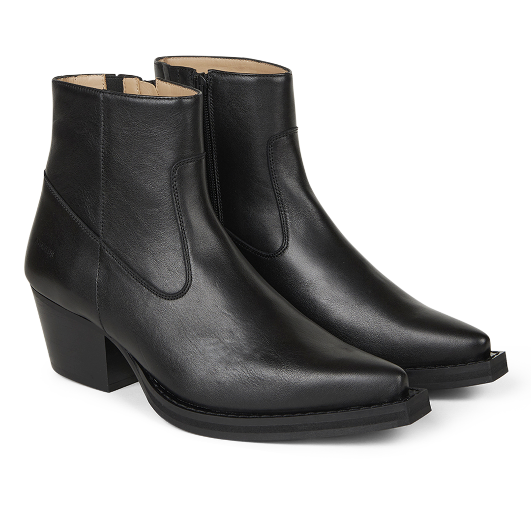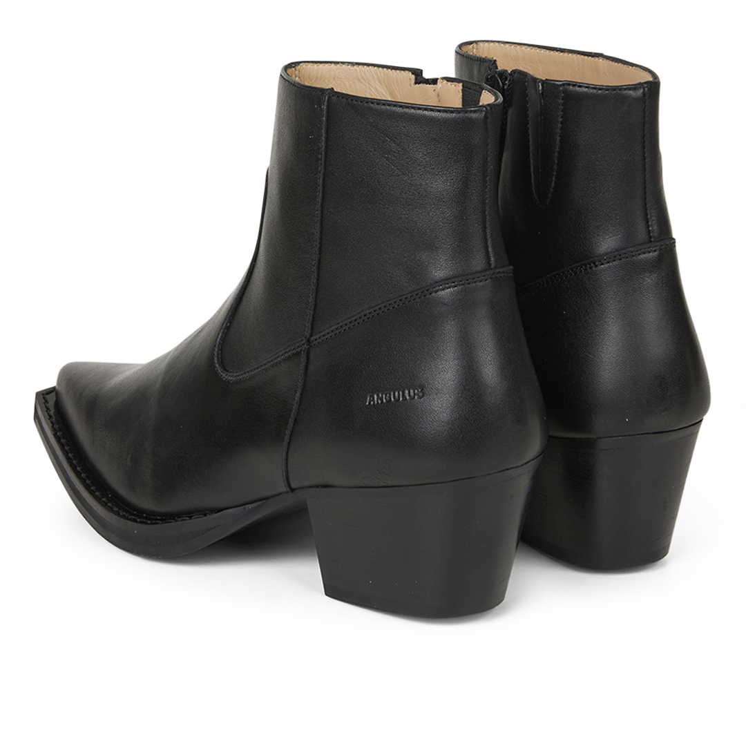 Der Stiefel hat eine spitze Spitze, eine hellschwarze Tunika-Sohle, einen geschlossenen Schaft mit Reißverschluss, eine Logoprägung an der Ferse, eine gepolsterte Innensohle, Lederfutter und ist aus natürlichem und atmungsaktivem Leder gefertigt.